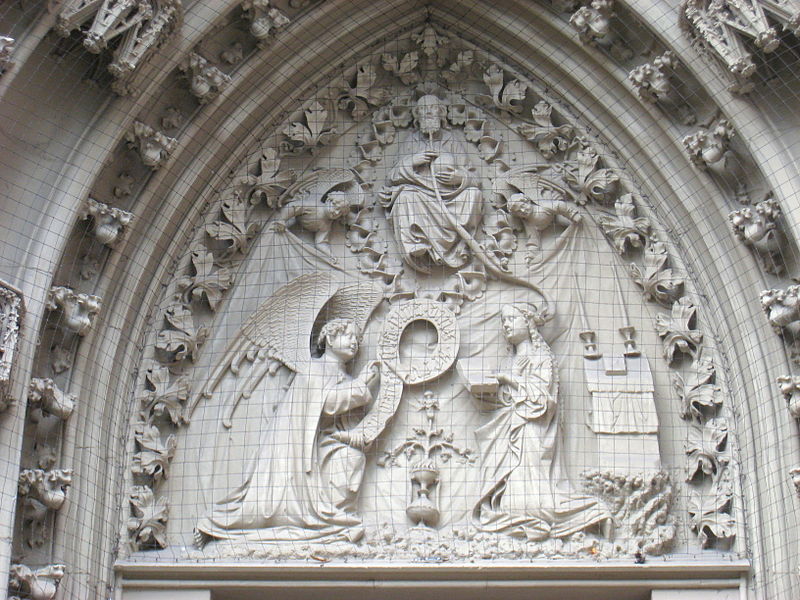 Ma l’esempio più sorprendente del puer parvulus formatus viene da una scultura. Nel timpano esterno della Marienkapelle (XV secolo) della cattedrale di Würzburg si vede un’Annunciazione, sovrastata da un imponente Dio Padre a figura intera. Le sue labbra sono appoggiate al bocchino di uno strumento a fiato lungo e sinuoso, una specie di tuba che arriva fino all’orecchio di Maria. Sul tubo sta scivolando, faccia in avanti, Gesù bambino. La campana della tuba è sostituita dalla colomba dello Spirito Santo, che sussurra all’orecchio di Maria. Tutta la Trinità è contemporaneamente rappresentata: Maria rimane incinta per opera dello Spirito Santo, grazie alla parola di Dio Padre che, giungendo al suo orecchio, si fa carne; è quel Gesù bambino che sta giocosamente scivolando da Dio Padre verso sua madre.